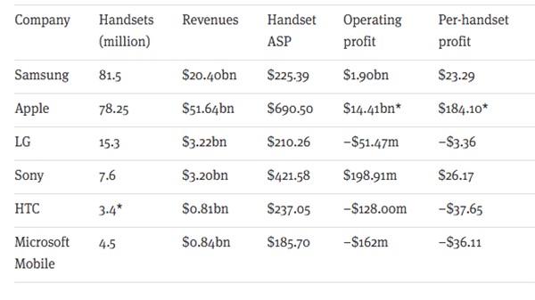 Apple vẫn là nhà sản xuất kiếm lời tốt nhất các smartphone của mình, khi mỗi sản phẩm bán ra hãng lãi đến 184 USD, vị trí thứ 2 khá bất ngờ đó chính là Sony, khi hãng kiếm lời được 26 USD trên mỗi sản phẩm bán ra, gã khổng lồ Samsung chỉ đứng thứ 3 với 23.2 USD. Các nhà sản xuất khác đều ghi nhận mức lỗ khá lớn, đáng chú ý là HTC phải chịu lỗ đến 37.65 USD trên mỗi smartphone mà hãng bán được, Microsoft cũng không khá hơn là bao khi phải bù lỗ trung bình 36 USD cho mỗi chiếc Lumia mà hãng bán ra.