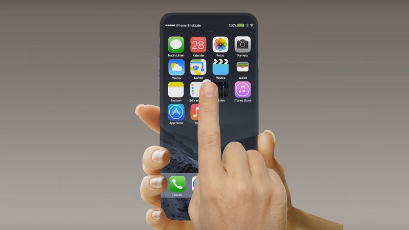 Mẫu thiết kế iPhone 7 của iPhone Tricks có màn hình OLED rộng 5.4 inch (2.048 x 1.080 pixel), với viền màn hình gần như... mất hút và nút Home hình như là loại điện dung, thay vì vật lý. Trước khi vuốt lên để mở khóa màn hình, bạn có thể tùy chọn truy cập nhanh ứng dụng gọi điện hay nhắn tin bằng cách vuốt xuống. Sau khi chọn xong ứng dụng cần mở, bạn vuốt lên để truy cập.
