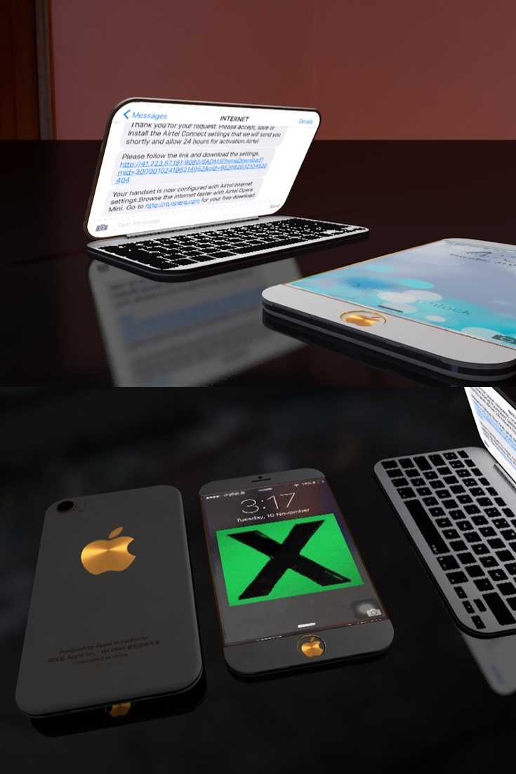 Máy có phần bản lề để kết nối với bàn phím vật lý. Nhìn thoáng qua làm mình nhớ về dòng N-series của Nokia trước đây. Đặc biệt là iPhone 7 Pro có tới 2 màn hình: Một bên ngoài dùng để trải nghiệm màn hình cảm ứng, còn bên trong thì dùng với bàn phím vật lý.