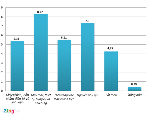 Trong đó, kim ngạch nhập khẩu 10 nhóm hàng chủ yếu của Việt Nam đạt 99,86 tỷ USD, chiếm 63,6% trong tổng kim ngạch nhập khẩu.