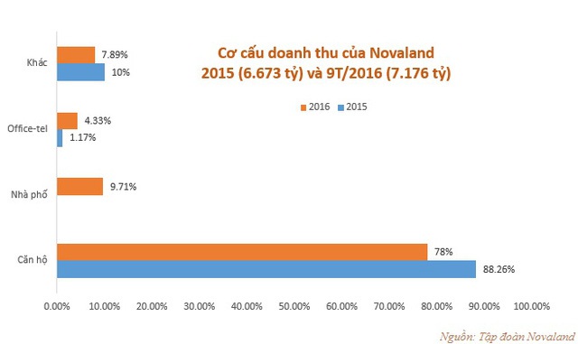 Trong khi năm 2014, 97% doanh thu của Novaland đến từ căn hộ thì trong giai đoạn 2015-2016, cơ cấu doanh thu của Novaland đã có sự thay đổi đáng kể, với nhiều loại hình BĐS hơn.