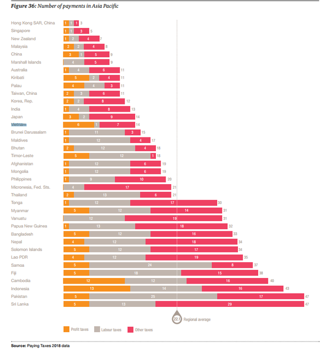 Nếu tính về mức thuế và lệ phí bình quân, Việt Nam nhỉnh hơn mức bình quân khu vực ở mức 38,1% so với 36,4%. Thậm chí Việt Nam còn xếp trên Nhật Bản (47,4%), Australia (47,5%) và Trung Quốc (67,3%).