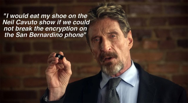 Nổi nhất trong hơn 2 năm qua có thể kể đến những vụ McAfee khẳng định mình hack được chiếc iPhone của nghi phạm trong một vụ án mà đến FBI cũng đang gặp khó khăn, nếu không được thì ông sẽ... ăn giày của mình . Nhưng sau đó thì hóa ra ông lại lên phỏng vấn và cười trừ, n ói rằng mình "chém gió vì lý do tốt đẹp đằng sau" mà thôi.