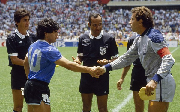 Đội trưởng đội tuyển Anh Peter Shilton bắt tay đội trưởng đội Argentina Diego Maradona trong trận "chung kết sớm" tại World Cup 1986.